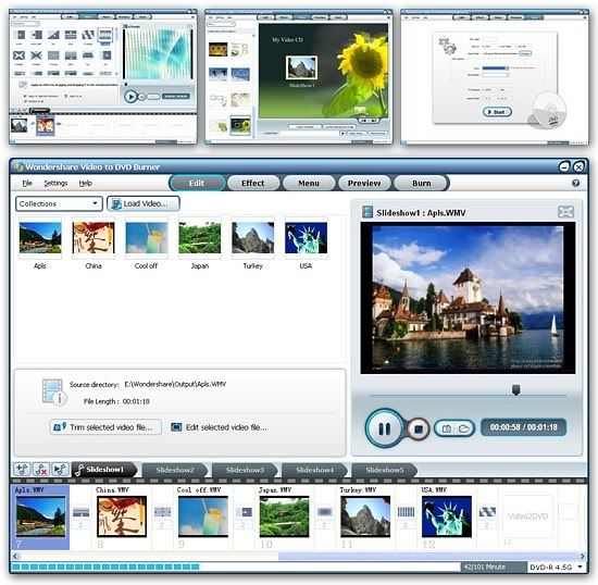 Simplicity and easy-of-use The user-friendly interface with easy and straight five-step process effortlessly guide you through the 1) Import, 2) Edit , 3) Effect , 4)Menu and 5) Export steps and make learning and using Video to DVD Burner literally a breeze.